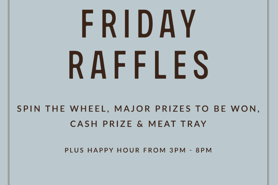 It’s raffle night, every Friday night. Spin the wheel for your chance to win. Plus we are throwing in Happy Hour from 3pm -8pm.